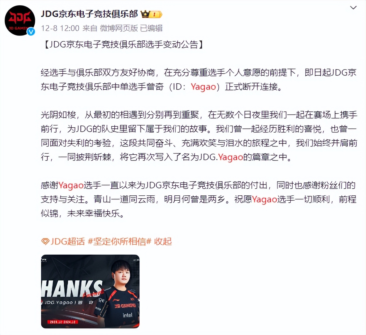 最初,JDG官宣文案中写道“我们赛场见”,意在祝愿Yagao在新东家延续辉煌。但Yagao的透露出不打职业之后,JDG迅速调整文案为“未来幸福快乐”,表达对Yagao未来生活的祝福。