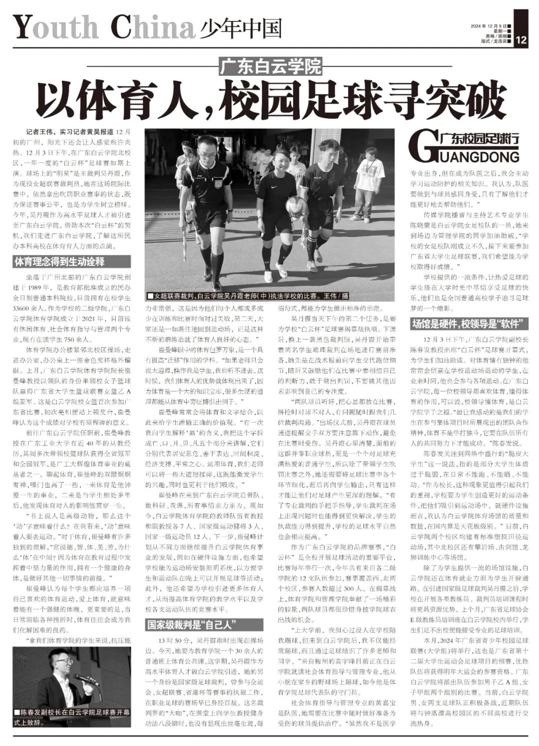 记者王伟、实习记者黄昊报道 12月初的广州,阳光下还会让人感觉些许炎热。12月3日下午,在广东白云学院北校区,一年一度的“白云杯”足球赛如期上演。球场上的“明星”是主裁判吴丹霞,作为现役女超联赛裁判员,她在这场院际比赛中,依然拿出吹罚职业赛事的状态,既为保证赛事公平,也是为学生树立榜样。今年,吴丹霞作为高水平足球人才被引进至广东白云学院。借助本次“白云杯”的契机,我们走进广东白云学院,了解这所民办本科高校在体育育人方面的点滴。