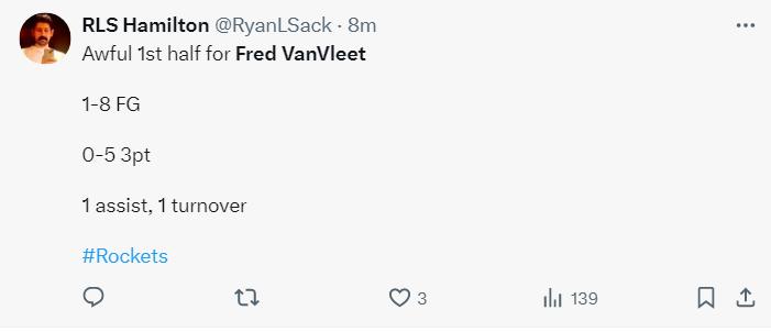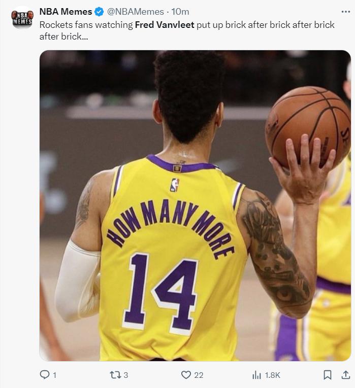三节打完范弗利特11中2,三分7中1,拿到5分1篮板6助攻3犯规2失误,命中率18.2%,三分命中率14.3%,被美媒狂喷各种丢砖块。