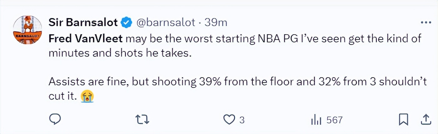 美媒:范弗利特可能是我见过最差的先发控卫,他的场均登场时间与出手数都很高,助攻没啥问题,但命中率39%,三分命中率32%太差。