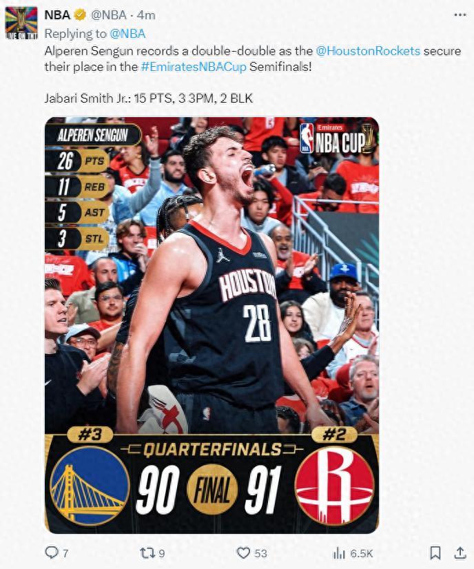 北京时间12月12日,火箭以91-90击败勇士拿下二连胜,火箭也晋级杯赛四强,西部杯赛决赛VS雷霆。这场比赛火箭在最后的3分03秒打出7-0完成逆转,杰伦格林两罚准绝杀,小贾封盖绝杀,范弗利特这场比赛虽然命中续命三分但还是被各种口诛笔伐。