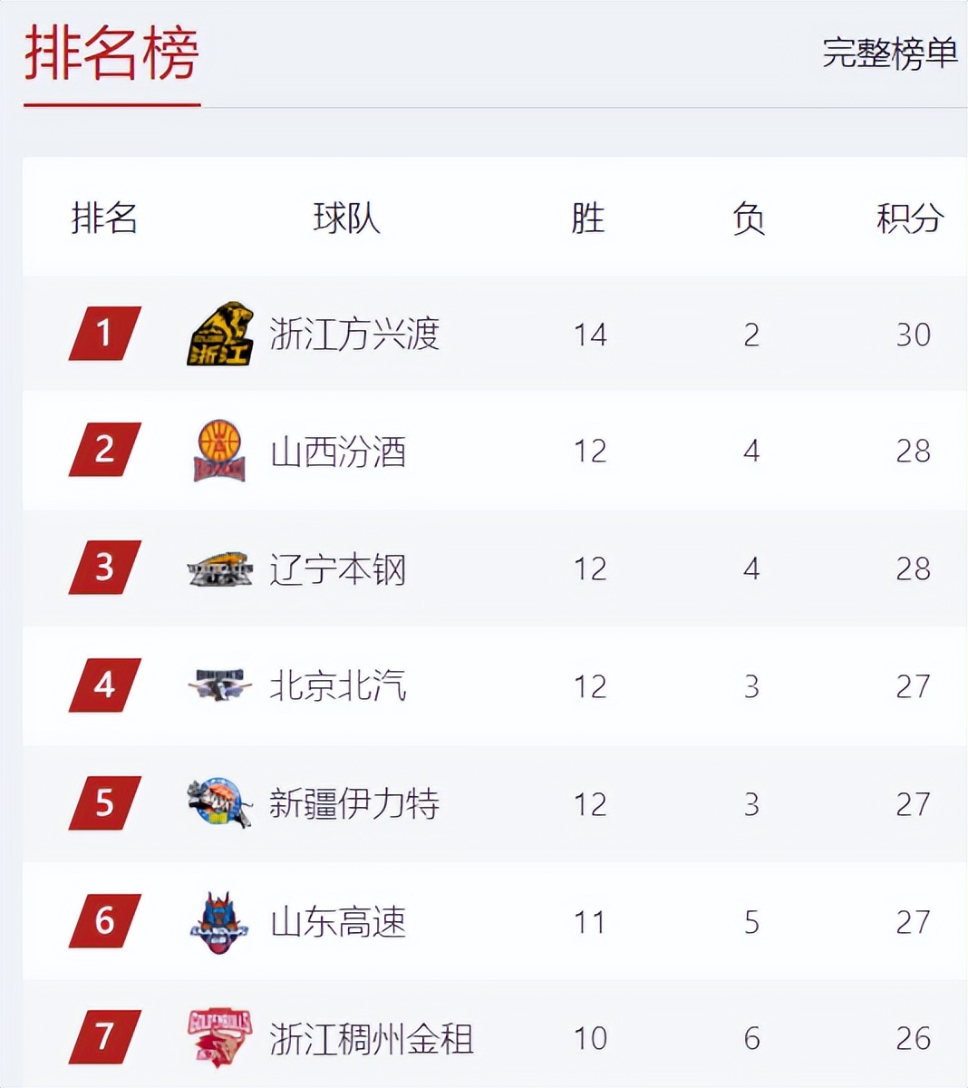 卫冕冠军辽宁队,在上一场大比分输球后,球队虽然暂居第二,不过,随着山西、北京等队相继赢球,辽宁队也丢掉了积分榜第2的位置,目前排名已经下滑到第3位。而且,在胜场上,他们与北京、新疆已经没有差距了。只不过比这两支球队多打一场,积分才获得靠前机会。北京队则位居第4,新疆队第5,这两队的战绩都是12胜3负,也有望冲击积分榜榜首的位置。
