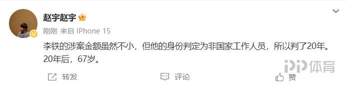 记者赵宇写道:李铁的涉案金额虽然不小,但他的身份判定为非国家工作人员,所以判了20年。20年后,67岁。