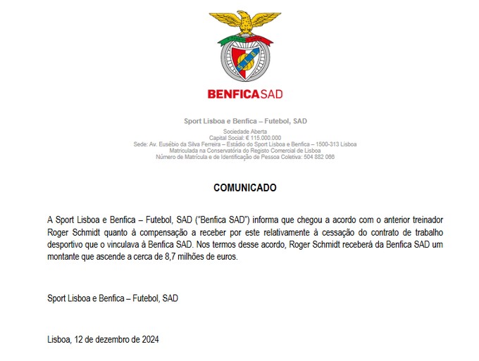 北京时间12月13日凌晨,本菲卡俱乐部官方发布公告,宣布与前任主帅施密特解约,并向其支付870万欧元的赔偿金。