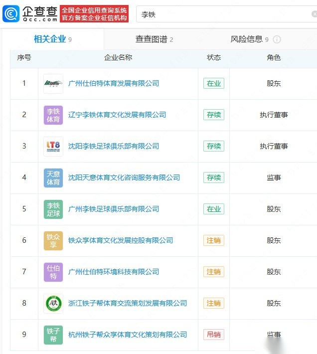 据企业信息查询软件显示发现,目前李铁共计关联广州仕伯特体育发展有限公司、辽宁李铁体育文化发展有限公司、沈阳李铁足球俱乐部有限公司等9家公司。
