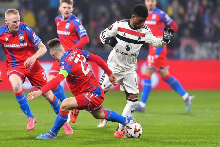 欧联杯联赛阶段第6轮的一场较量中,比尔森胜利和曼联在上半场结束后暂时0-0战平。