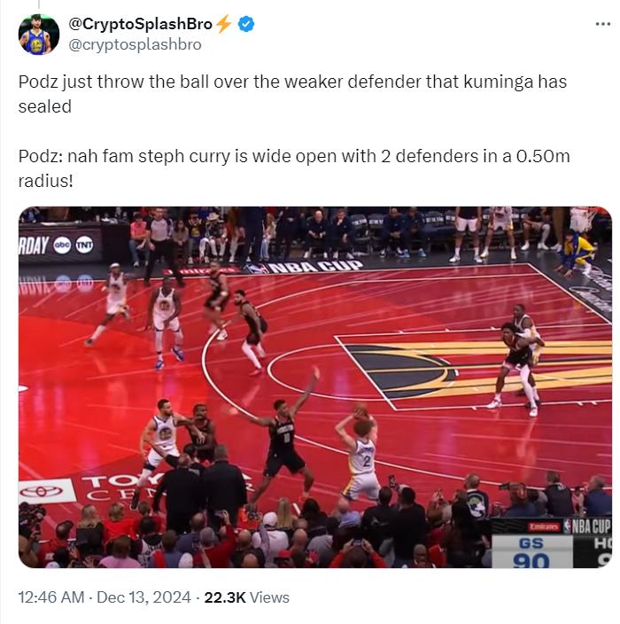 勇士媒体:波杰姆斯基应该将球给到防守较弱球员这一边,库里半径0.5米内太多防守者,而库明加篮下只有一个防守者,高吊就是完成开放没有防守者。