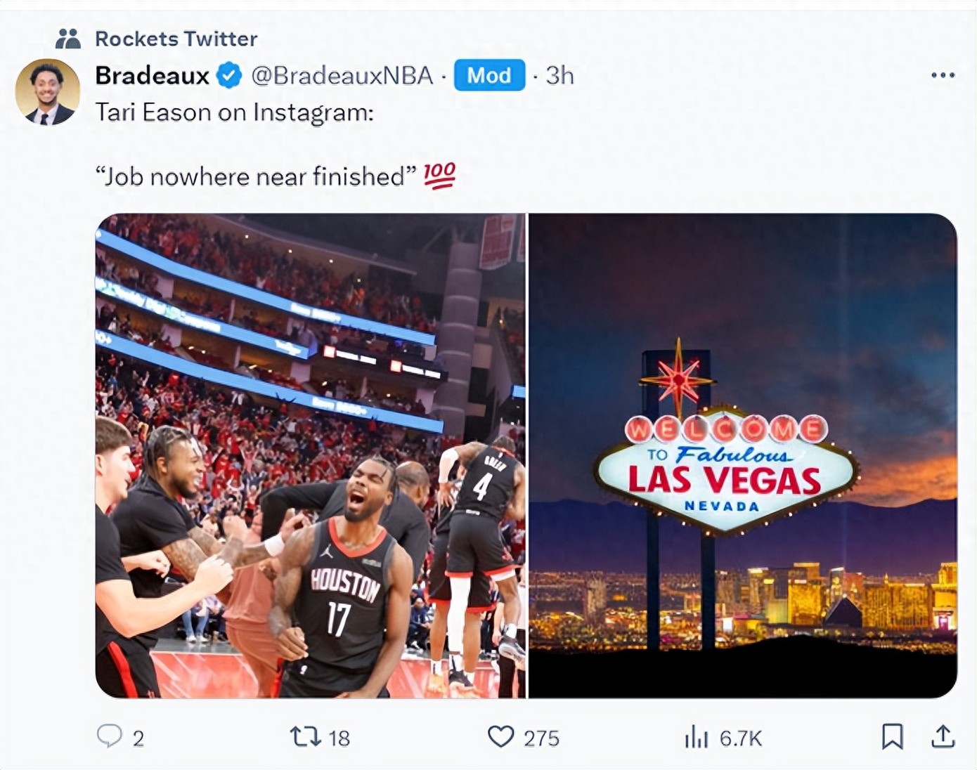 北京时间12月13日,火箭前锋塔里-伊森晒出一张拉斯维加斯的图片写道:“我们还有未完成的事业”。这张图似乎让勇士的球迷们很不满,因为他们还沉浸在火勇大战之中,他们依旧认为是裁判黑掉了勇士,就算裁判报告已经出炉,证明库明加就是犯规,他们还是不管不顾。