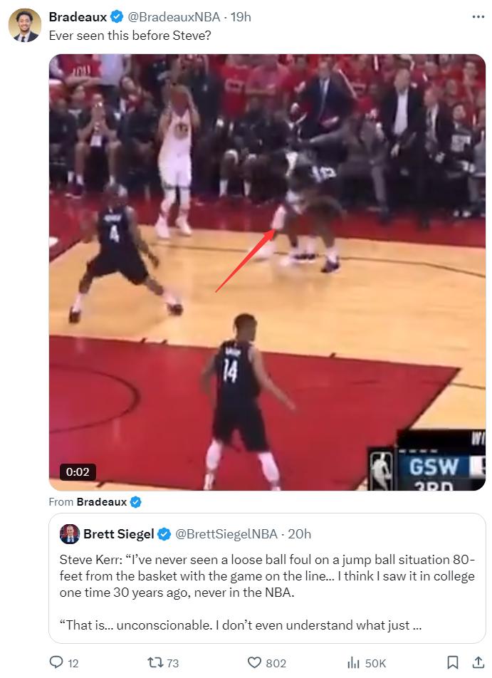 勇士记者Brett Siegel赛后直言裁判双标,范弗利特与佩顿抢球就不犯规,库明加去抢格林的球就犯规。(裁判报告出炉后,这条推文也没有删除)