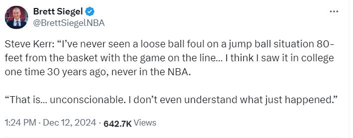 勇士记者Brett Siegel晒出科尔那段话:“我从未见过在距离篮筐八英尺的地方争抢地板球还吹犯规的,我无法理解,这不合理,就连小学裁判都不会那样吹。”