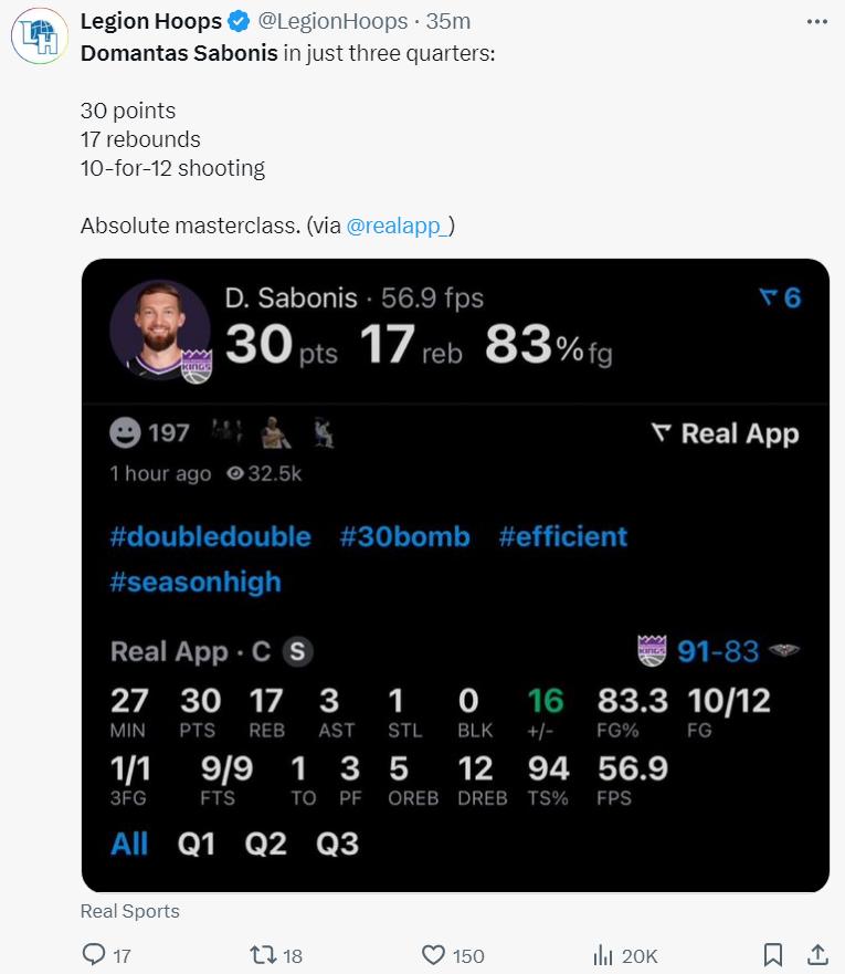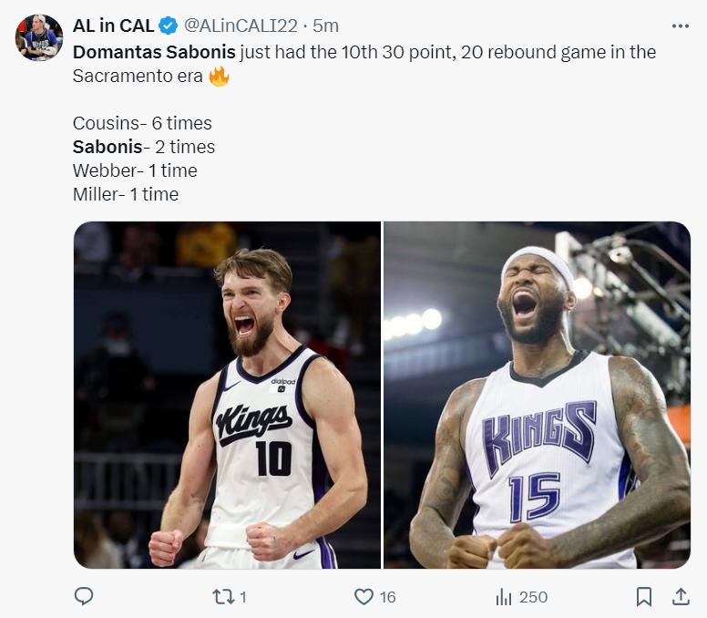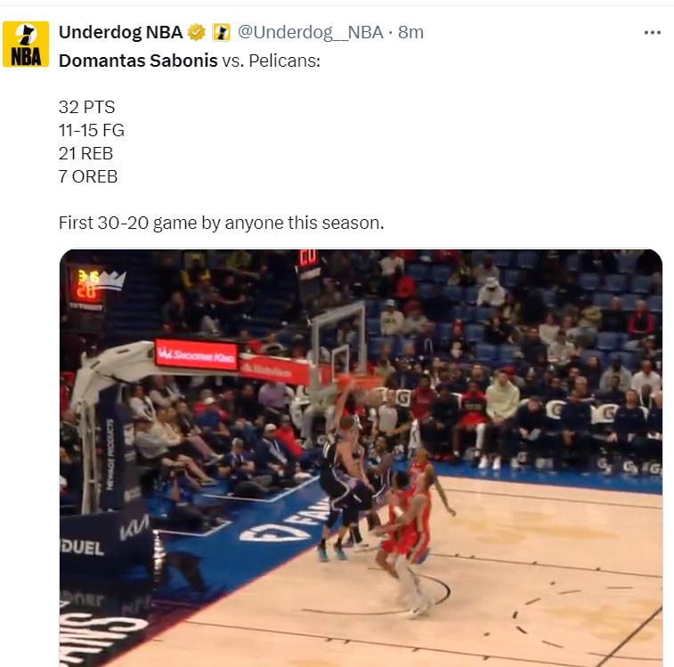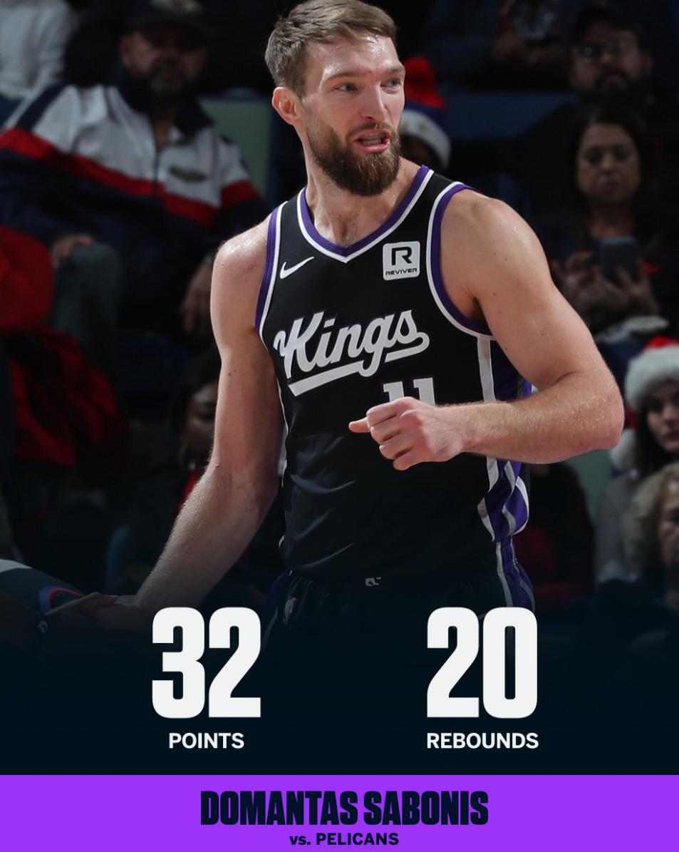 小萨在上半场就已经拿到20分12篮板的狂暴数据,他成为国王第六位半场能拿下20+10的球员,这也是他本赛季第22次两双,前24场比赛完成22次两双。
