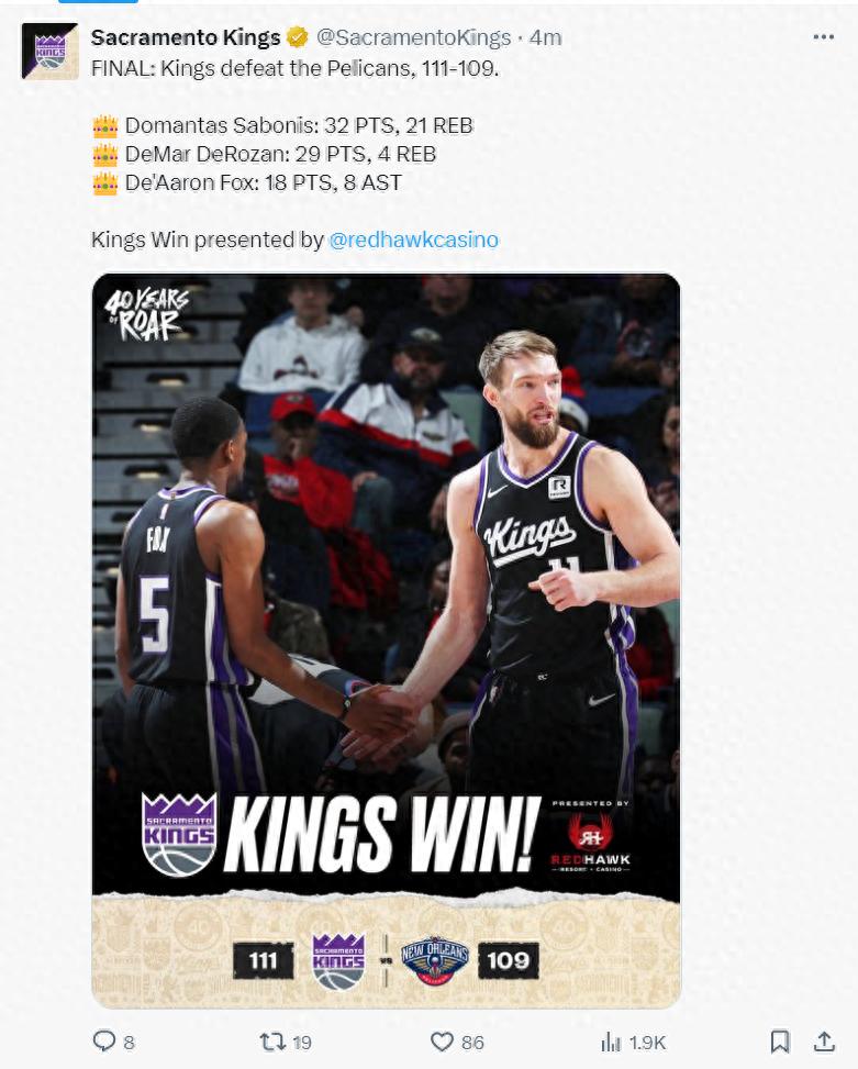 北京时间12月13日,萨克门托国王队111-109险胜新奥尔良鹈鹕队。这场比赛国王末节还剩6分30秒一度领先鹈鹕达到14分之多,没想到随后被鹈鹕疯狂追分,德章泰-穆雷终场前3秒如果命中就完成了绝平,不得不说这支国王实属令人失望。
