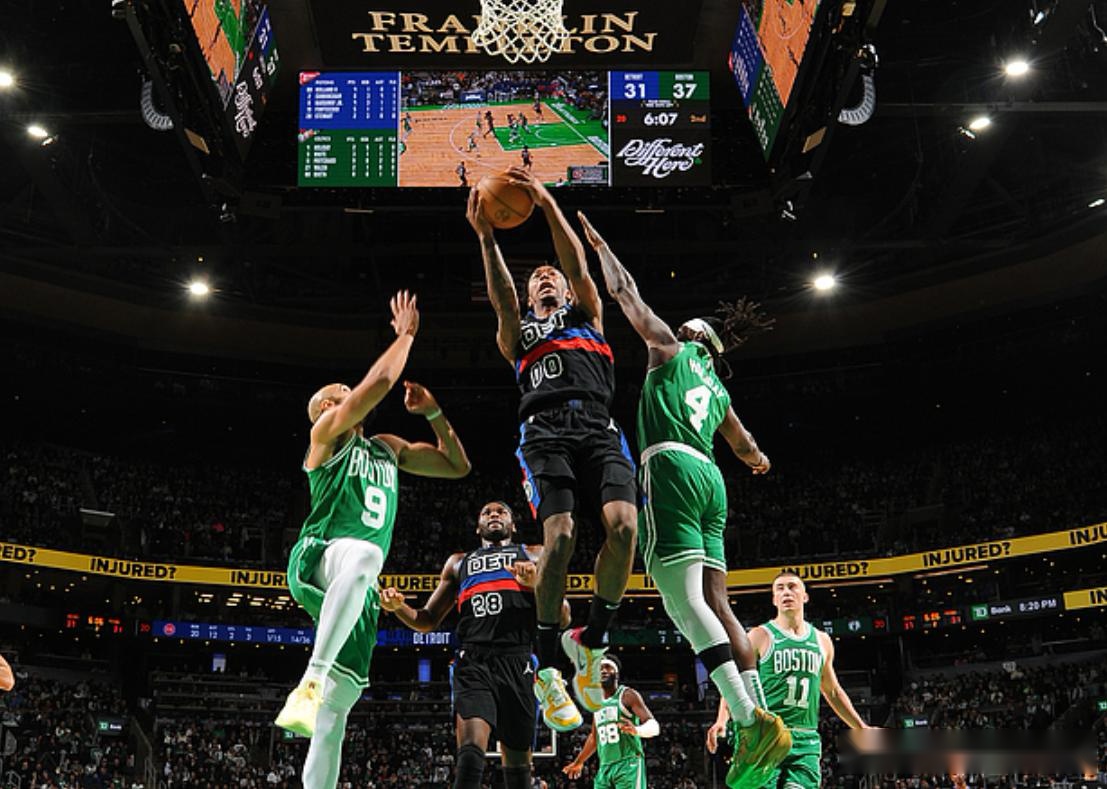 第一节比赛,波津三分,坎宁安抛投回应,波津扣篮,哈里斯连得5分回应,活塞6-5,怀特、普里查德三分,哈达威、汤普森、坎宁安回应,活塞12-11,布朗、波津反超比分,坎宁安追分,凯尔特人领先1分,科内特连续得分、霍福德、布朗上篮,凯尔特人把分差扩大到11分,首节战罢凯尔特人27-16领先。