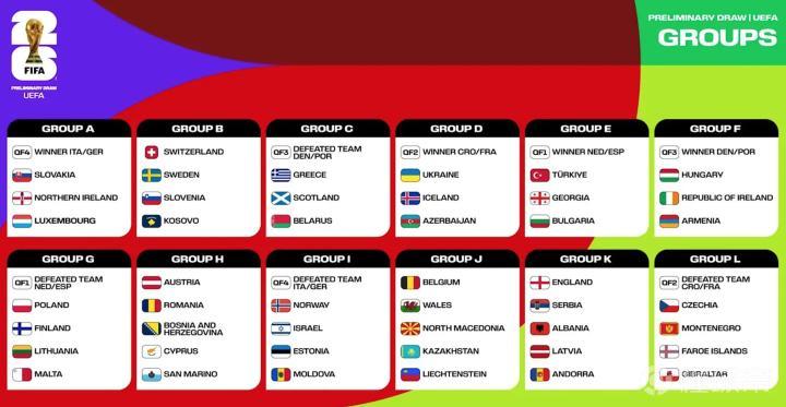 L组:欧国联1/4决赛败者(法国/克罗地亚)、捷克、黑山、法罗群岛、直布罗陀