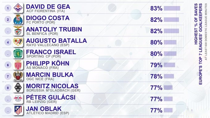 根据知名足球数据媒体CIES(足球天文台)的统计数据,本赛季到目前为止,德赫亚的扑救成功率为83%,在欧洲排名前七的联赛中排名最高(英超、意甲、西甲、德甲、法甲、荷甲、葡超)。