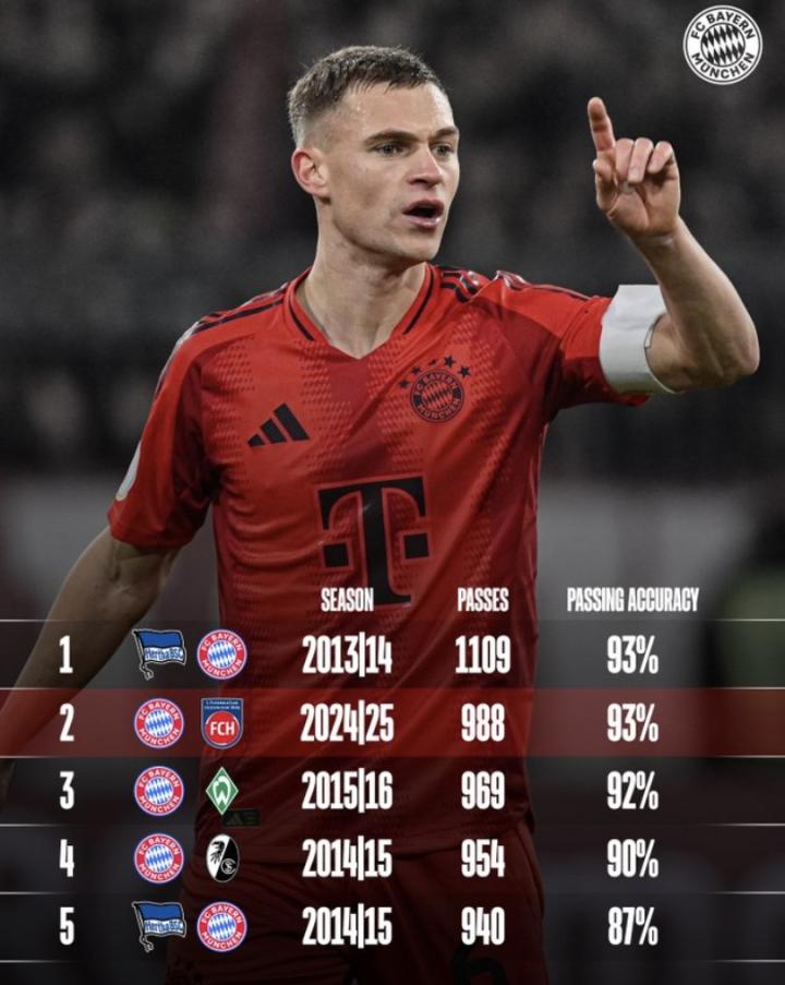 2、拜仁vs海登海姆 2024/25赛季 传球988次 传球成功率93%