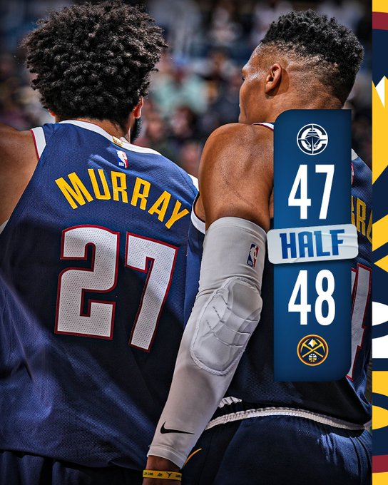 掘金:约基奇9投6中,三分球2中2,拿下16分7个篮板;贾马尔·穆雷20分、阿隆·戈登14分、小迈克尔·波特17分、威少5分5次助攻和3个抢断,正负值+21