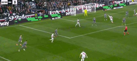 第56分钟,罗德里戈大禁区前沿接应居勒尔的传球,摆脱调整后起脚远射破门,皇马反超,3-2!