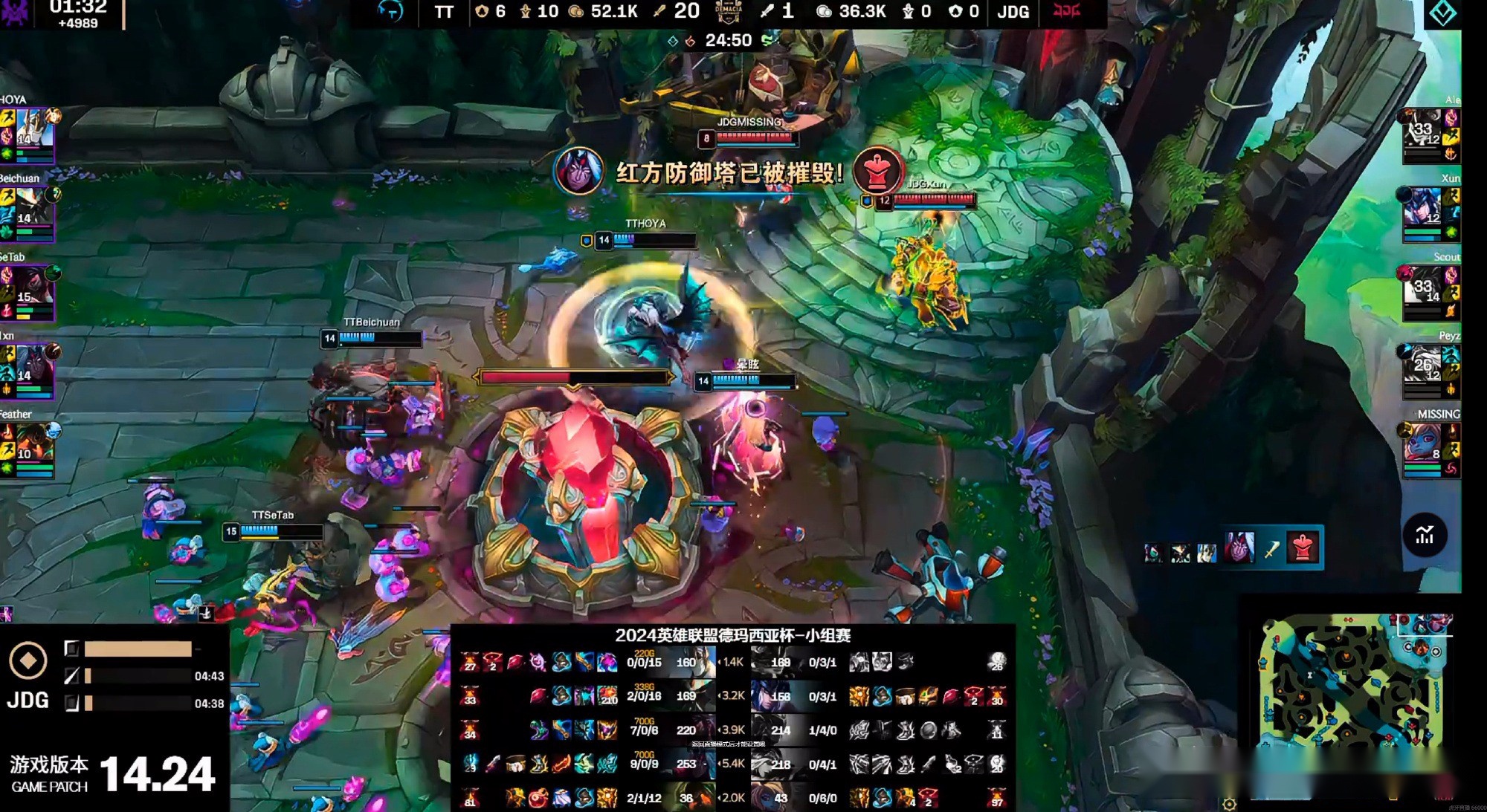 第二局的对手是TT,TT这边的阵容是上单Hoya,打野北川,中单SeTab,下路1XN和Feather,和去年相比只有中路变了,ucal离队,SeTab加入。不过这场TT可以说是碾压式击败了JDG,最后的人头数是20-1,完全把JDG当人机打。新中单SeTab的阿卡丽对线期就压制了Scout,15分钟就领先了4K,中期团战JDG毫无还手之力,TT拿下大龙后直接拿下胜利。