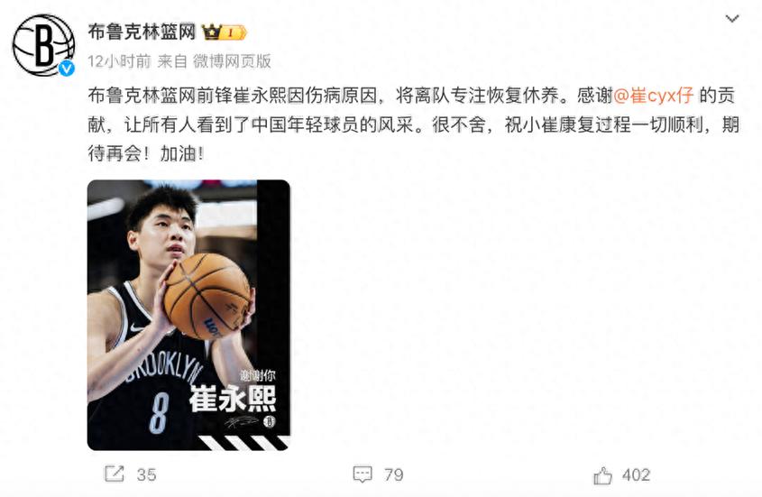 篮网队官方微博也为小崔送上了祝福,配了一张他帅气投篮的照片,上面写着“谢谢你崔永熙”。大家都很不舍,但也祝他一切顺利,期待他再次归来!