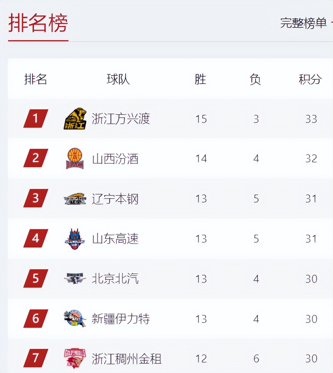 北京队和新疆队,他们由于少赛一场,排名上稍微吃亏,北京队赢球后,结束三连败,战绩变成13胜4负,排在第5位,新疆队的战绩也是13胜4负,排在第6位。浙江队则排在第7位,战绩是12胜6负,青岛队主场大胜同曦队以后,战绩提升为11胜7负,排在第8位。不过,青岛队的位置不算稳定,身后的几支球队都是虎视眈眈,随时都有取而代之的可能。