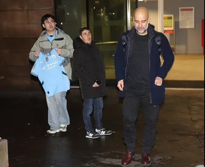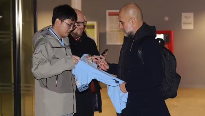 据报道,当瓜迪奥拉回到位于迪恩斯盖特城市套房的公寓楼下时,他遇到了几名曼城球迷,其中一人拿出了一件球衣给他签名。