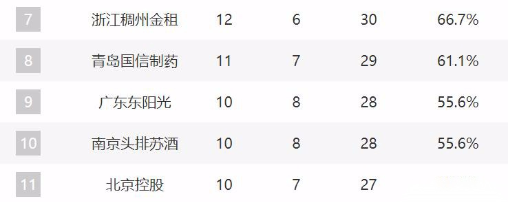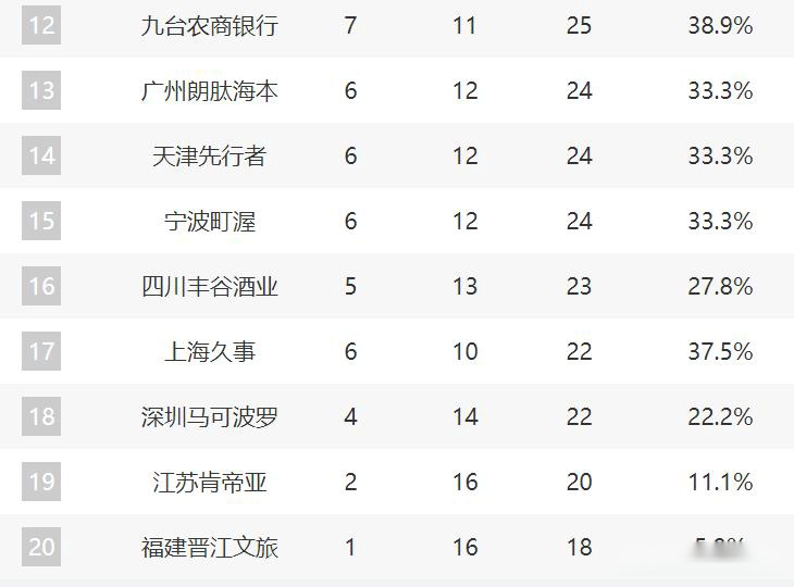 不过12名开外的球队已经拉开差距了。特别是第12名的吉林,他们距离北控三个胜场。而且现在第12的竞争会非常激烈,广州、天津、宁波、四川和上海的差距都不是很大。特别是上海,已经获得五连胜了。而且这轮状态糟糕的情况下还是可以拿下广州,再加上他们未来四场比赛的对手都不是很强,他们有希望保持一个一波九连胜,然后来到第12的位置。毕竟他们距离吉林就差1个胜场,这会是后续比赛的焦点。