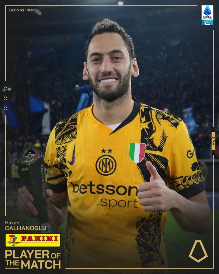 官方消息,恰尔汗奥卢当选拉齐奥对阵国际米兰一役全场最佳。