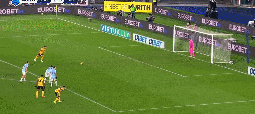 37分钟,国米右侧角球开到禁区,邓弗里斯第一点头球攻门被门将扑出,后续门前一片乱战,德弗里补射破门,但双方争抢中劳塔罗不慎踢中吉戈面部,VAR长时间介入,主裁亲自观看回放补吹了先前邓弗里斯头球攻门时吉戈的手球犯规,主裁判罚点球,恰尔汗奥卢点射命中,国米1-0领先