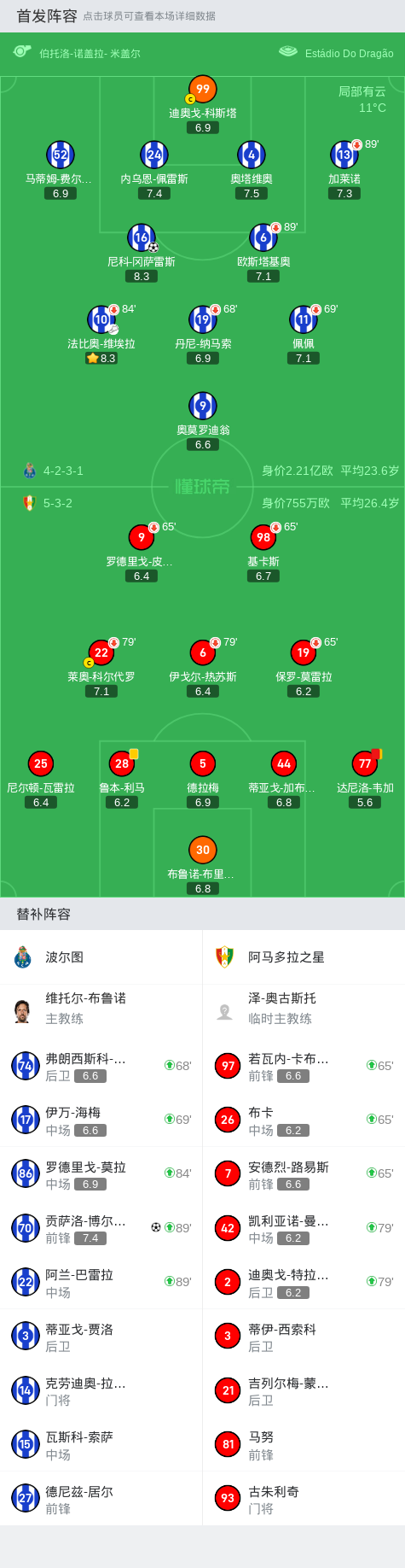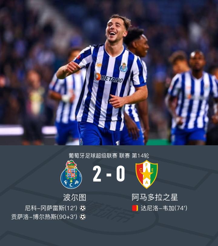 在葡萄牙足球超级联赛第14轮的比赛中,波尔图坐镇主场迎战阿马多拉之星。比赛中,波尔图展现了强大的进攻实力。尼科-冈萨雷斯在法比奥-维埃拉的精妙传球下,成功攻入一球,为波尔图取得领先。比赛后期,阿马多拉之星的达尼洛-韦加因累计两张黄牌被罚下场,给球队带来了不小的压力。补时阶段,罗德里戈-莫拉助攻贡萨洛-博尔热斯,再次攻破对方球门,锁定胜局。最终,波尔图以2-0战胜阿马多拉之星,取得了本场比赛的胜利。