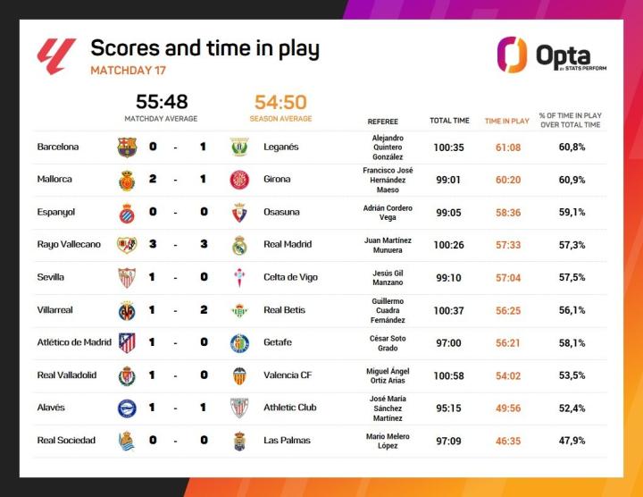 据统计,巴萨vs莱加内斯是西甲第17轮净比赛时间最长的比赛,为61分08秒。