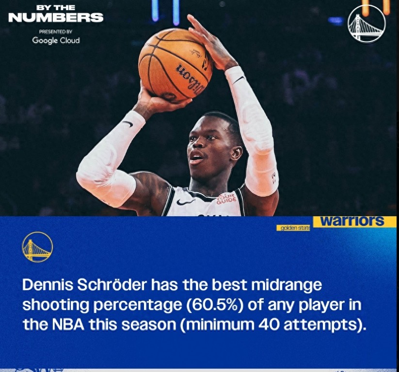 勇士官方发推:“丹尼斯-施罗德本赛季中距离命中率60.5%,在至少出手40次的球员里第一。”