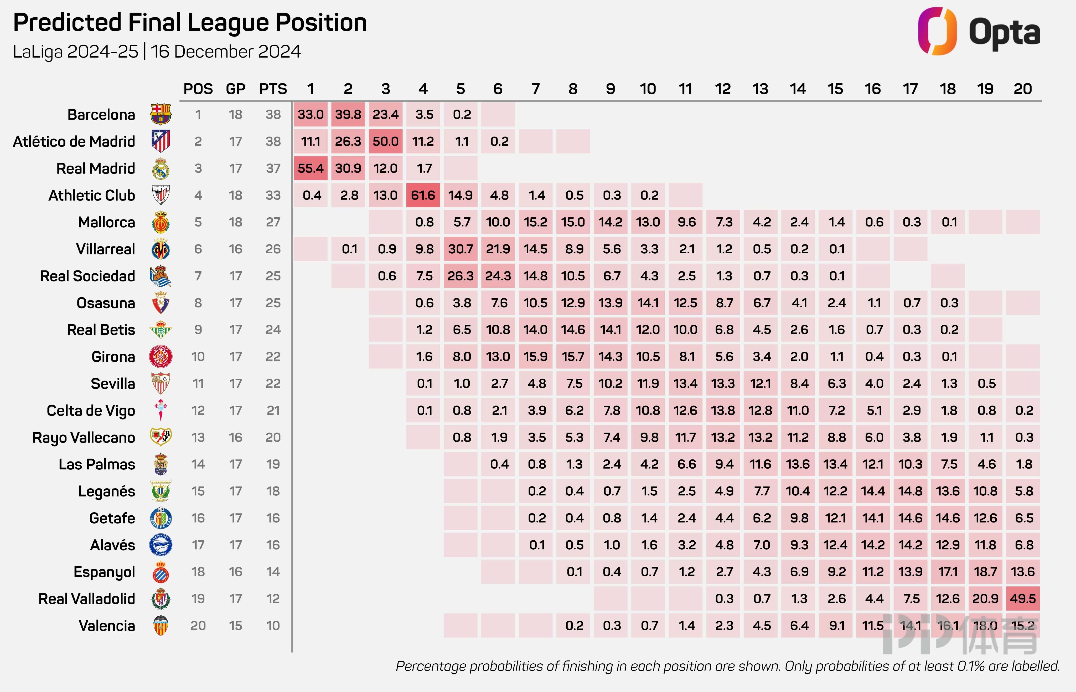 西甲第17轮比赛战罢,Opta预测了各队夺冠的概率,皇马55.4%最高,巴萨33%次席。