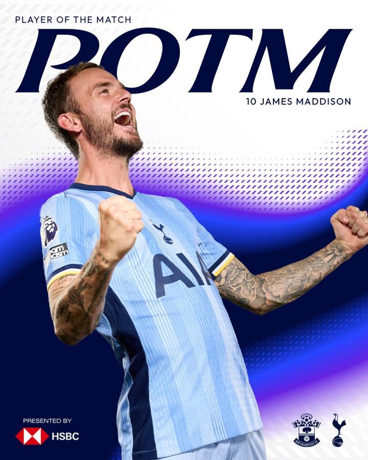 热刺官方消息,梅开二度的麦迪逊当选热刺5-0大胜南安普顿队内最佳球员。