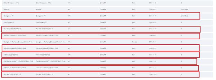 更新过后的国际足联注册禁令披露系统中显示,中国职业联赛男足俱乐部的转会注册禁令已经减少6条,目前沧州雄狮还剩1条,武汉三镇还有2条。