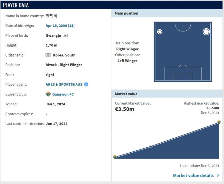 本月,德国转会市场更新了K联赛的球员身价,其中冬窗前往热刺报到的韩国小将梁民革身价为350万欧元。