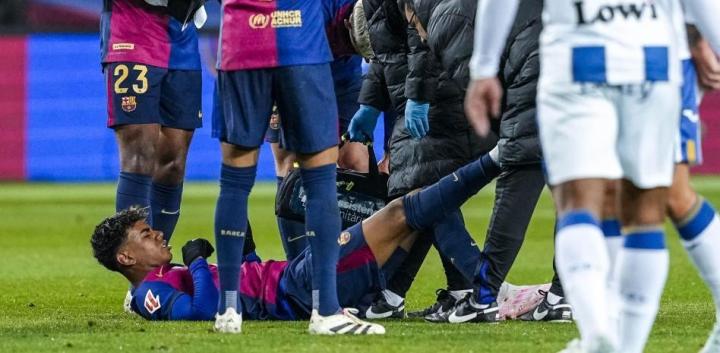 亚马尔在上半场中段遭遇了一个强烈的犯规,接受了治疗,甚至在中场前表示要换下场,但他坚持继续比赛,并且直到下半场后期才被换下。