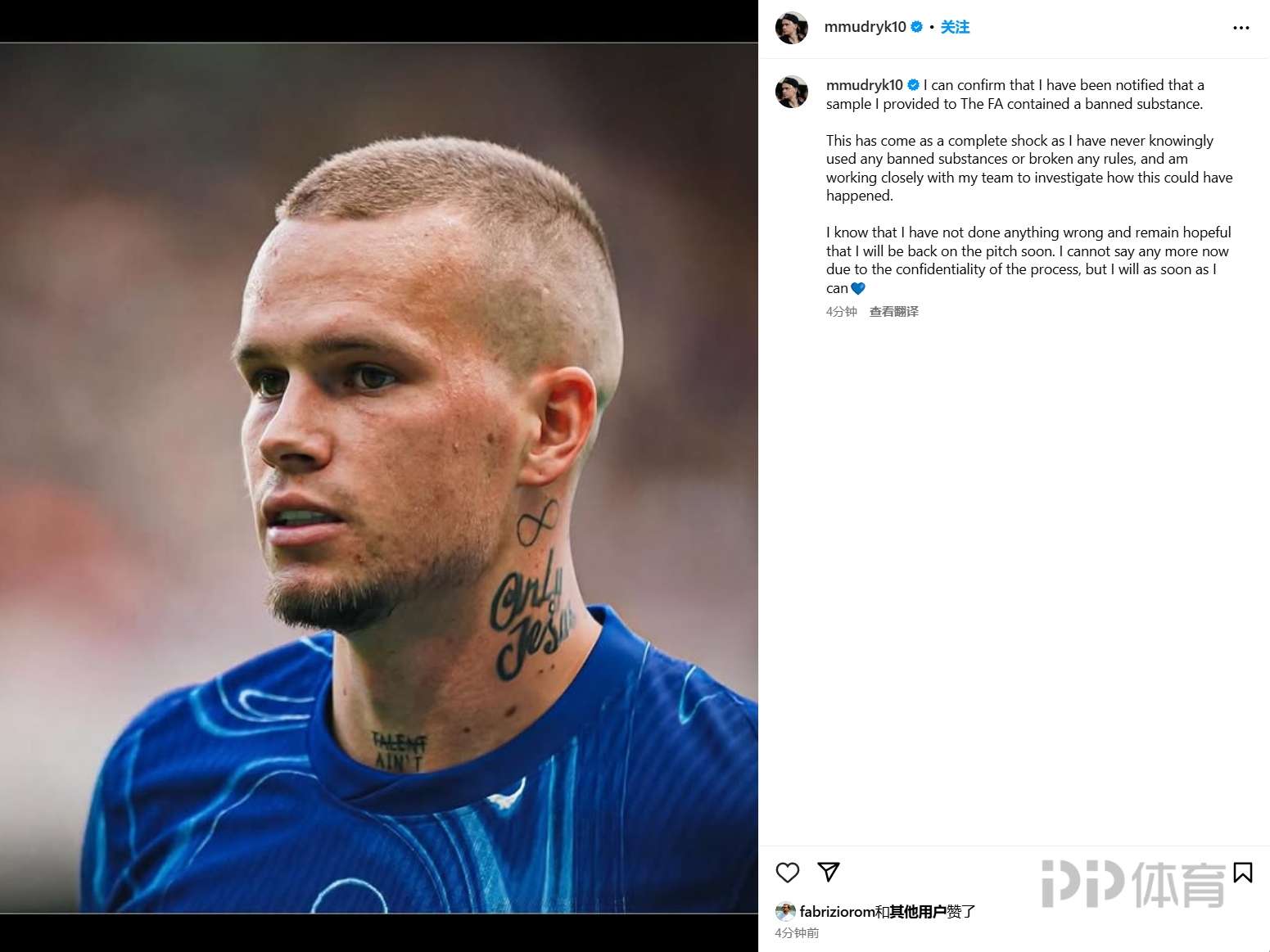 有关药检呈阳性一事,切尔西边锋穆德里克通过个人社媒发布了声明。