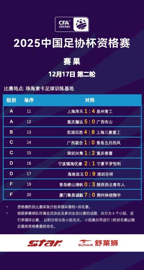 2025中国足协杯资格赛(12月17日)第二轮赛果情况:泉州青工、重庆瀚达、上海三菱重工、广西联合、重庆春蕾、宁波镇海优康、深圳吉祥、陕西西北青年人、厦门集美诚毅获得胜利。