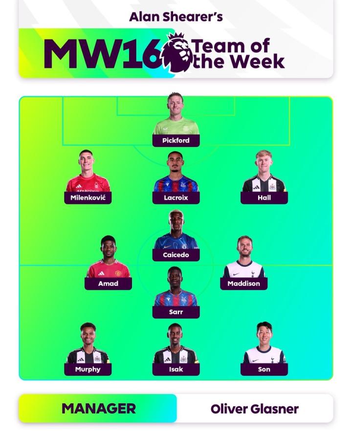 英超官方发布了阿兰-希勒评选的英超第16轮最佳阵容,孙兴慜、阿马德、伊萨克等人在列。
