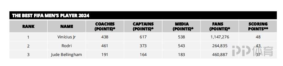 FIFA年度颁奖典礼结束,维尼修斯当选年度最佳球员(世界足球先生),FIFA官方公布了得票情况。