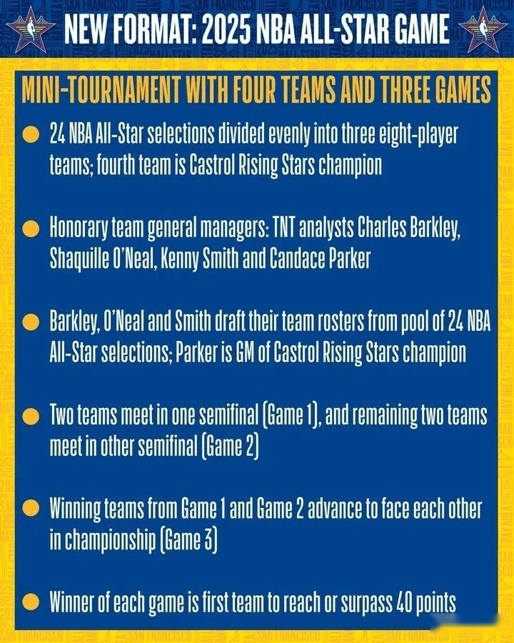 NBA官方和球员工会宣布在勇士主场大通中心举行的2025年NBA全明星赛将采用新的赛制: