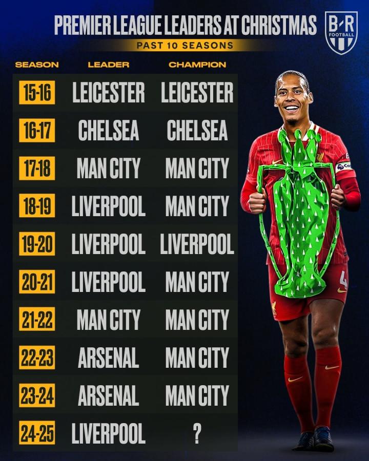 外媒Bleacher Report对比了过去九个赛季英超圣诞冠军与联赛最终冠军,其中5支球队拿到了最终的联赛冠军。