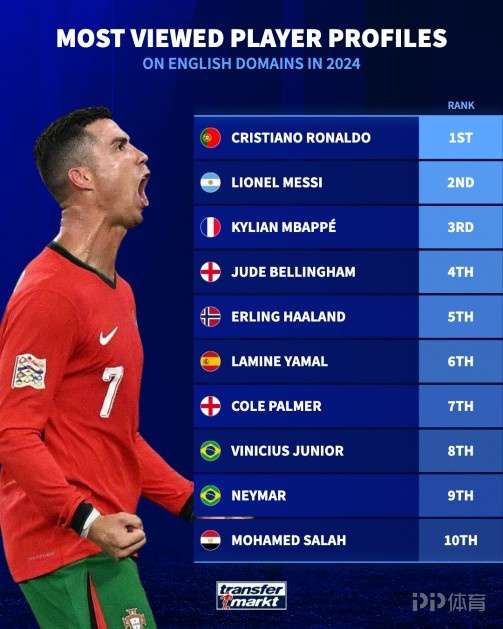 德转公布2024年度球员页面浏览量排行榜(英文域名),C罗资料页浏览量排名第一,梅西、姆巴佩分列二三,帕尔默进入前十。