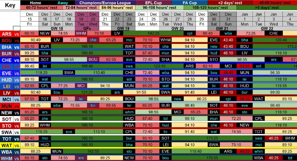 除了比赛都数量之外,比赛间隔也非常重要。英超比赛让人目不暇接的背后,是球队的连轴转不停。