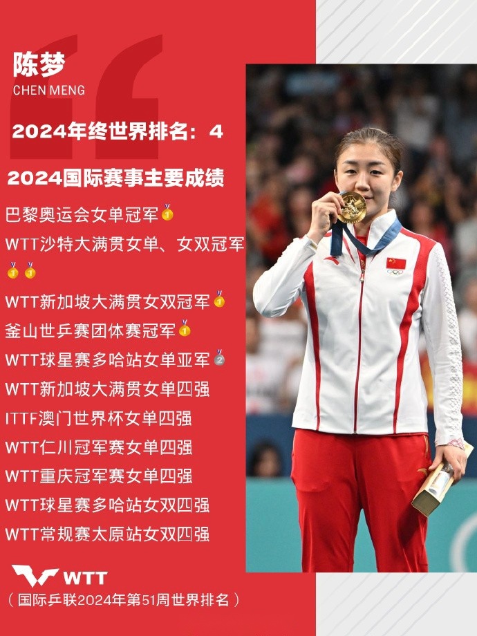 而同样在今天,世界乒联官方社媒也发文对陈梦的2024年进行了点评,在列举了陈梦今年所取得的荣誉的同时,也寄语道: 不惧挑战,捍卫荣耀。期待在新的一年里继续发光发热,迎接更美好的未来。