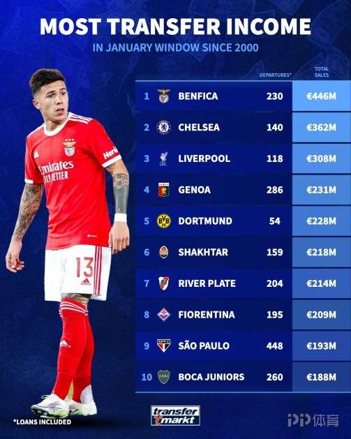 德国转会市场晒出了21世纪在冬窗卖人赚钱最多的球队排行榜,本菲卡高居第一,切尔西和利物浦排在二三位,所有交易也包括了租借转出。(交易次数和总收入)