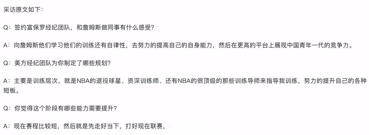 在确定签约经纪公司Klutch sports之后,杨瀚森亲自对外透露未来计划,谈到美方经纪团队会怎样帮助自己时,他说:“(美方经纪团队的安排) 主要是训练层次,就是NBA的退役球星、资深训练师、还有NBA的很顶级的那些训练导师来指导我训练,努力的提升自己的各种短板。 ”