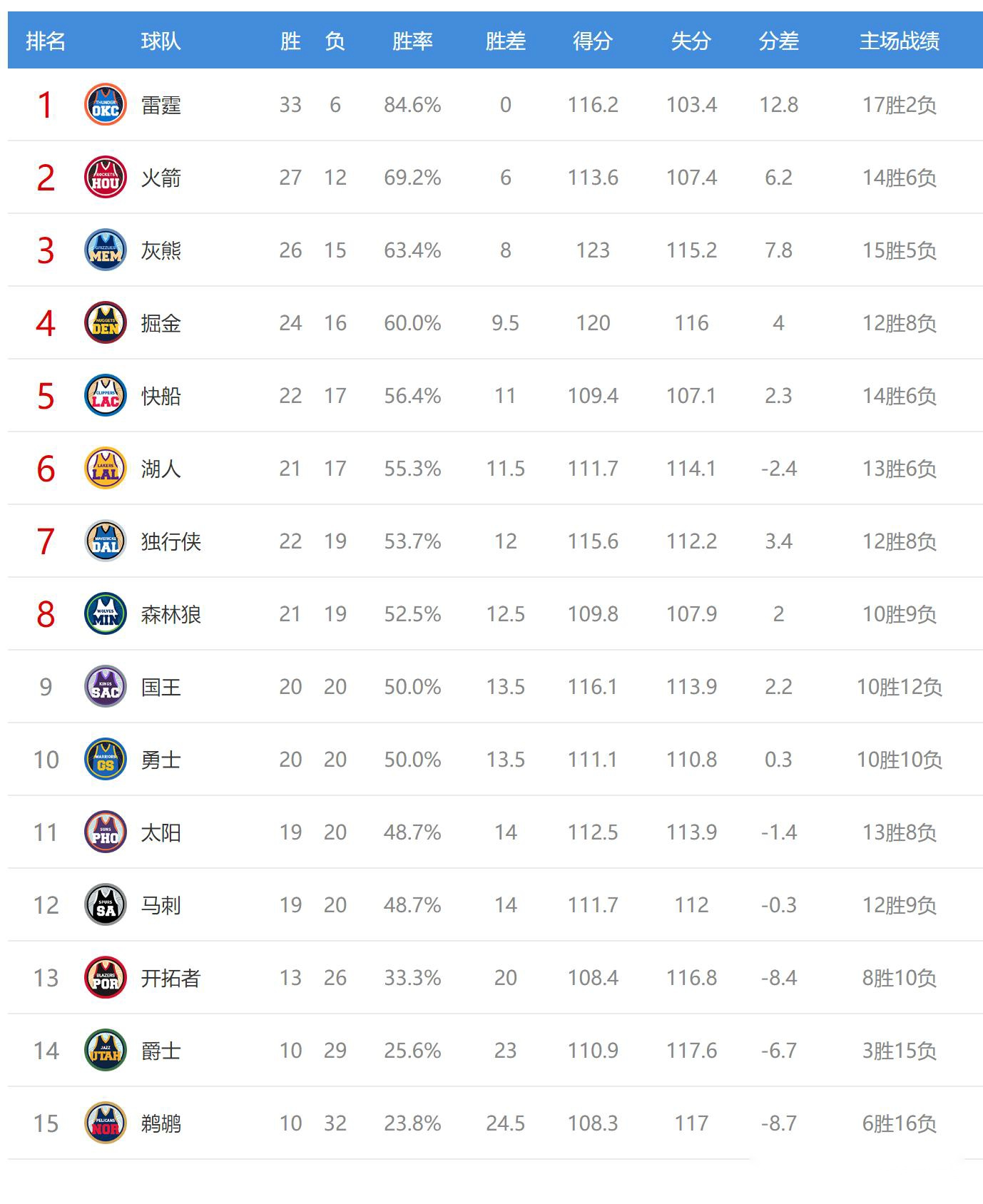 今日比赛后湖人、独行侠排名互换,国王、勇士、马刺排名互换,总计5支球队排名互换,下面是西部最新排名情况: