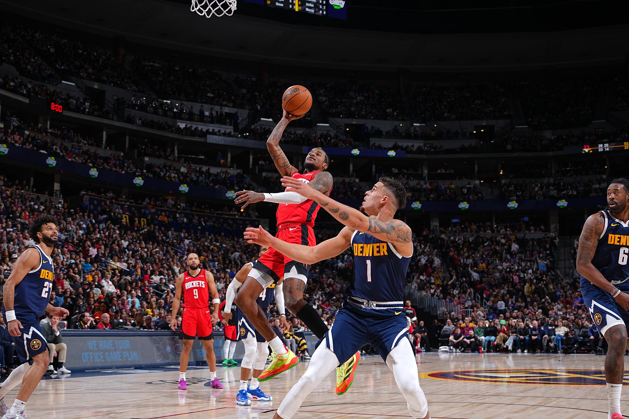 火箭队的格林上半场得到21分,申京得到10分、8个篮板和5次助攻;掘金队的穆雷得到13分,威少得到12分,布劳恩得到11分。
